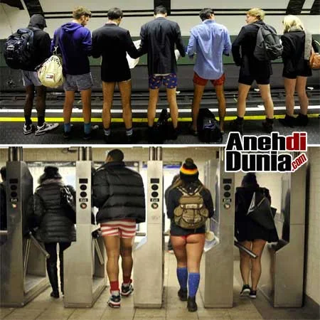 No Pants Subway Ride adalah hari besar yang berlangsung setiap bulan Januari di Amerika Serikat. Pada hari ini, warga secara sukarela menaiki kereta api tanpa mengenakan celana. Jadi jangan heran jika suatu hari Anda berkunjung ke Amerika Serikat dan banyak penumpang kereta bawah tanah yang berkeliaran dengan atasan lengkap tetapi hanya mengenakan celana dalam. Hari raya unik ini bermula pada tahun 2002, dipelopori oleh 7 orang penumpang kereta api di Kota New York. Entah apa tujuan tindakan mereka tersebut. Yang jelas, pada tahun 2006 jumlah sukarelawan yang mempertontonkan celana dalam di stasiun bertambah hingga menjadi 150 orang. Beberapa orang sampai ditangkap pihak berwajib karena dianggap mengganggu ketertiban umum. Tetapi event tahunan ini bukannya dilarang malah menjadi semakin besar skalanya. Tahun 2013 lalu, setidaknya ada 60 kota yang berpartisipasi dalam kegiatan aneh ini.
